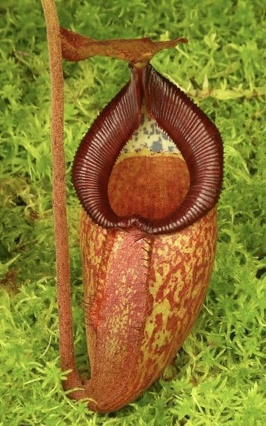 The female parent is a selected clone of N. petiolata selected for its classic flat peristome and the male parent is N. talangensis, selected from amongst the assorted clones offered under BE-3187.