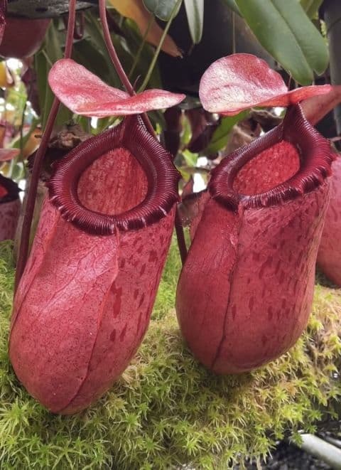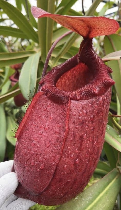 This amazingly outstanding cross is one of the most impressive hybrids ever made. The pitchers have the waxy texture of N. sibuyanensis with the sheer size of N. merrilliana and can grow to be quite enormous. All the clones have pitchers that are either a deep orange or red and have huge volume. It’s also vigorous, robust and an easy grower. Simply a stunning plant all round, This cross is believed to be a strong contender for the largest carnivorous plant in the world by volume and has pitchers measured to hold a volume of 3.2L, but larger pitchers are expected to be possible.
