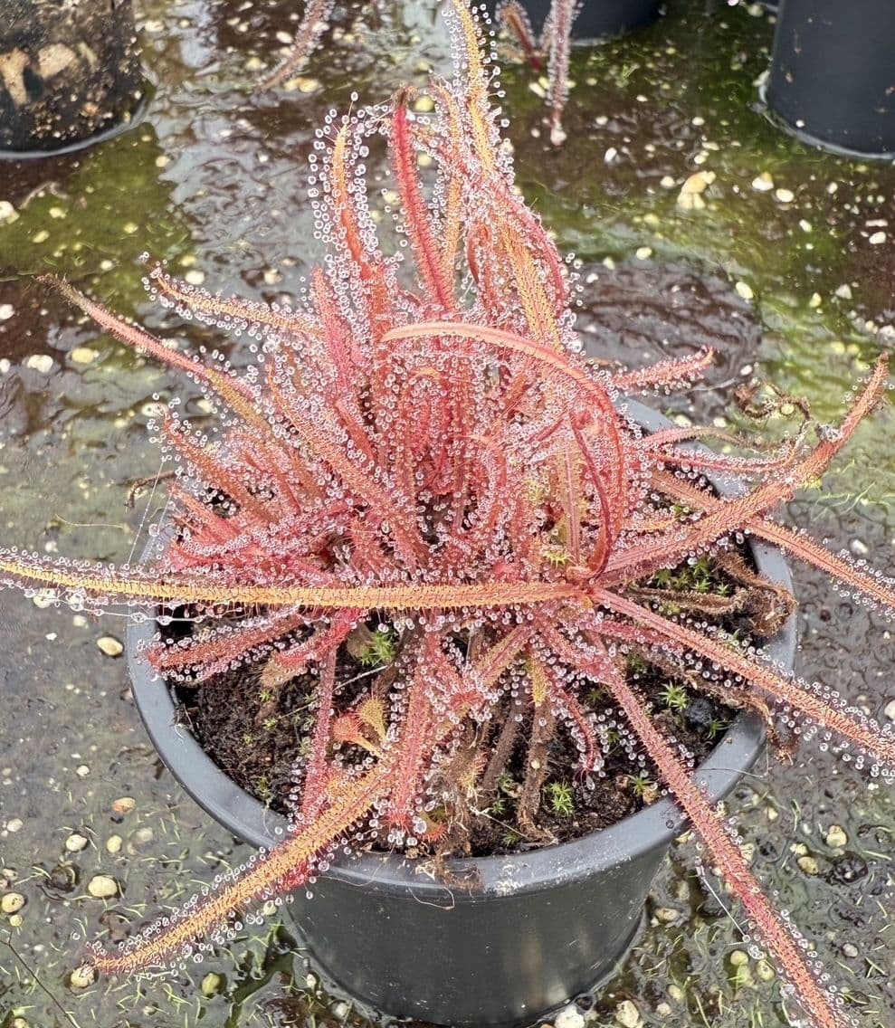 This sundew is from Queensland ,Australia and likes a warm ,humid, shady position in a heated greenhouse or terrarium. The sword-shaped foliage is up to 7.5cm in cultivation. flowers are red in colour.Tropical sundew needs warm humid conditions,Beautiful bright red flowers, Ideal plant for the terrarium.Sent out ready potted