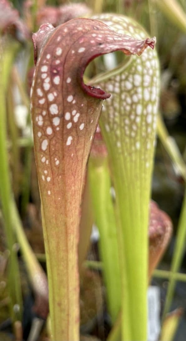 S.leucophylla x S.minor, overhanging lid dappled red and white, pink to orange flowers. Stand these plants in a tray of rainwater from March to October in a bright sunny position. During the winter keep the plants just damp and cool, remove any dead foliage at this time.