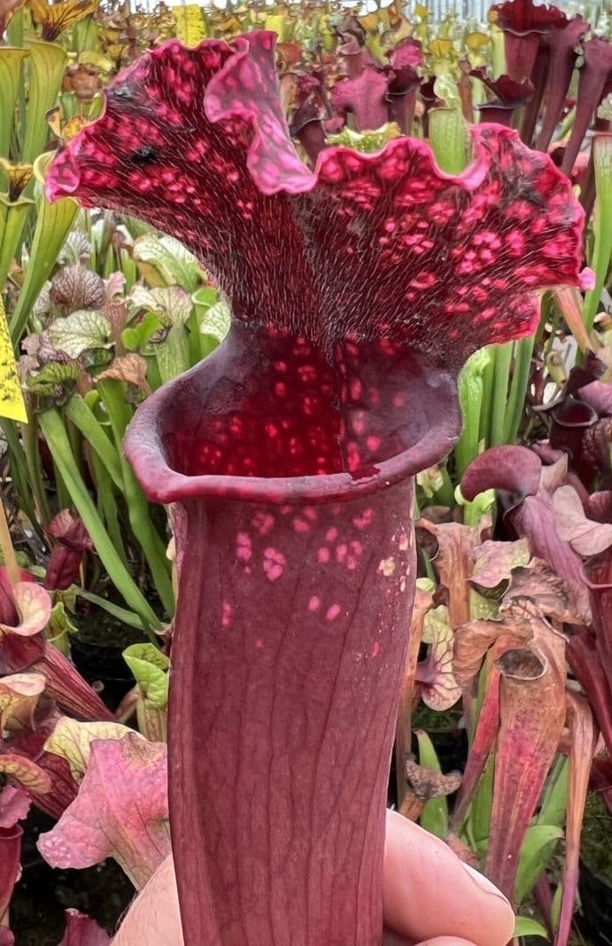 DESCRIPTIONThis new Sarracenia hybrid was raised by Mr Roy Cheek and launched at the BBC Gardeners world live show June 2016.This plant produces stunning bright pink to purple pitchers throughout the growing season, awarded an RHS AGM in the 2 year Sarracenia trial held on our nursery now available from culture, semi mature plants sent out ready potted.
