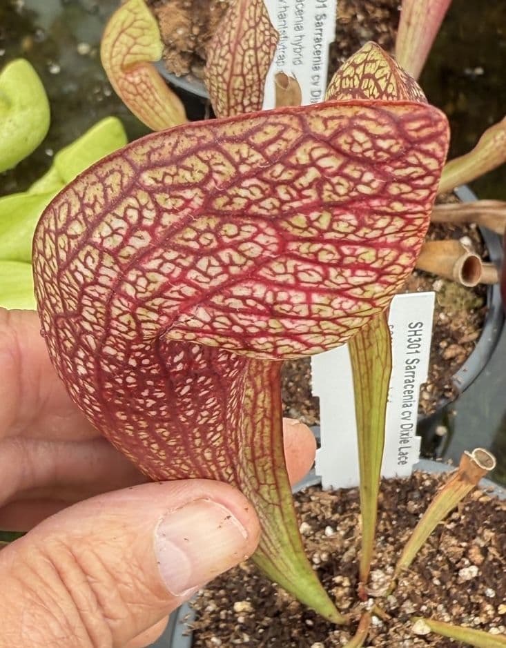 This is an unusual hybrid The female parent was a natural hybrid between Sarracenia leucophylla and S. alabamensis subsp. wherryi collected in Perdido, Alabama in 1985 and grown at the McMillan Greenhouse at UNCC. The pitchers resemble S. leucophylla, although only up to 30 cm (12 inches) tall, and are distinctly pubescent. The male parent was an artificial hybrid of Sarracenia psittacina and an unknown partner, probably S. purpurea, 'Dixie Lace ' quickly grows into a multi-crowned clump and flowers freely. Its sturdy pitchers are produced throughout the growing season. Many pitchers survive well into the winter, even after severe cold (down to -7°C or 20°F). However, protection from prolonged cold allows the plant to remain attractive throughout the winter. Flowering occurs at mid-season, and the red flowers are similar to those of the parents. The pitchers are about 25 cm (10 inches) tall, and are poised erect to slightly arching outwards. The hood shows the S. psittacina character of being squared-off at the front and tightly closed when the pitchers first elongate. Later, the hoods of most pitchers flatten and form an opening underneath a strongly rounded hood with laterally flared sides. The pitcher tube gradually enlarges to more than 4 cm (1.5 inches) wide below the hood. Mature plants sent out ready potted UK ,Excellent for a bog garden, one of the best ,Sent out ready potted -